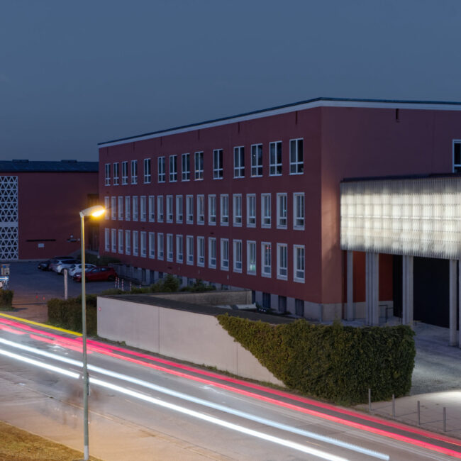 Die Erweiterung der Nutzflächen für beide Institutionen, dem ASG und dem Gründerzentrum, sollte als eingeschossiger Holzbau zwischen dem ASG und dem Inn.Kubator und auf dem Verwaltungstrakt des ASG errichtet werden. Städtebaulich war es wichtig vor den größeren Baukörpern zurück zu stehen und als Brücke zwischen den beiden Gebäuden zu dienen. Der Verwaltungstrakt gibt mit seiner räumlichen Aufteilung ein Fassadenraster vor, das in der Aufstockung nicht angewendet werden konnte, da die räumlichen Bedürfnisse der Erweiterung nicht in Einklang mit dem Altbau standen. Dies begründet die Reaktion einen einheitlichen Riegel zu schaffen in dem eine Fassadenteilung nicht unmittelbar ab zu lesen ist. Die Räume auf der Südseite nehmen sensible Nutzungen auf, wie die Räume des Schulpsychologen, den Sanitätsraum und des stellvertretenden Schulleiters. Die Fassade muss folglich einheitlich, hell und die Privatsphäre schützend sein. Die vorgelagerten Faserzementlamellen stehen 90° zur Verglasung und haben einen Abstand und eine Tiefe von 20 cm. Eine Einsicht in die dahinterliegenden Räume von den angrenzenden Hauptgebäuden ist somit fast nicht möglich. Trotz des Schutzes vor Einsehbarkeit sind die Räume lichtdurchflutet, offen und freundlich. Zur Innstraße bietet der Inn.Kubator aus der Distanz einen Einblick in die Gründerszene und den Gründerfirmen die Möglichkeit auf sich aufmerksam zu machen.